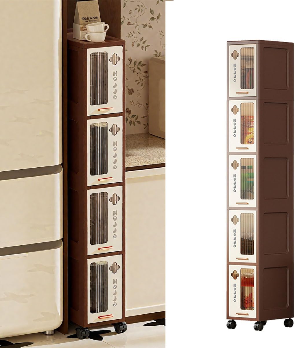 Armário Estreito 20cm com Rodas, Organizador Dobrável para Cantos e Frestas, Multiuso Banheiro/Cozinha, À Prova D'Água (5 Camadas, Marrom)