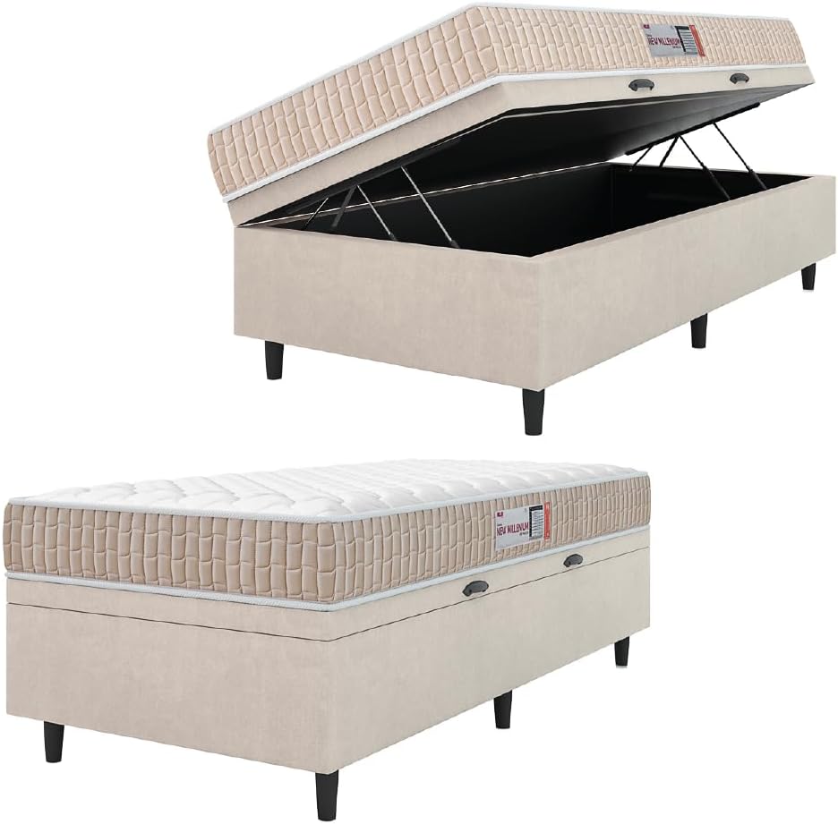 Cama Box Baú Colchão Solteiro Espuma D33 New Millenium 88x188x60cm Branco/Bege Hellen – Suporta até 120kg por Pessoa