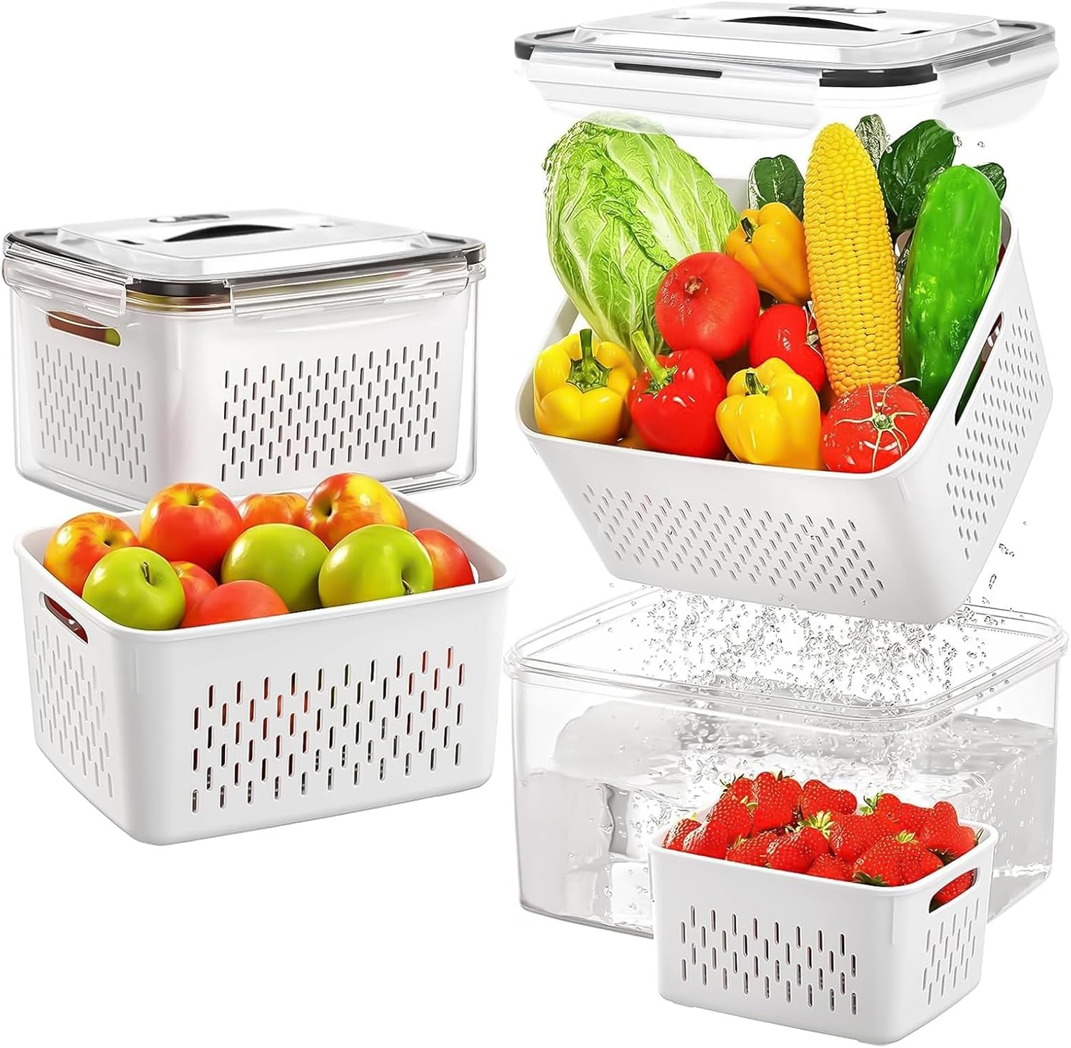 Kit 4 Organizador Geladeira Tampa Hermetica Organizador Armarios Cozinha Trava Borracha Vedante Conjunto Pote Hermetico Kit Pote Hermeticos Cesto Escorredor para Frutas Saladas Alimentos Vegetais