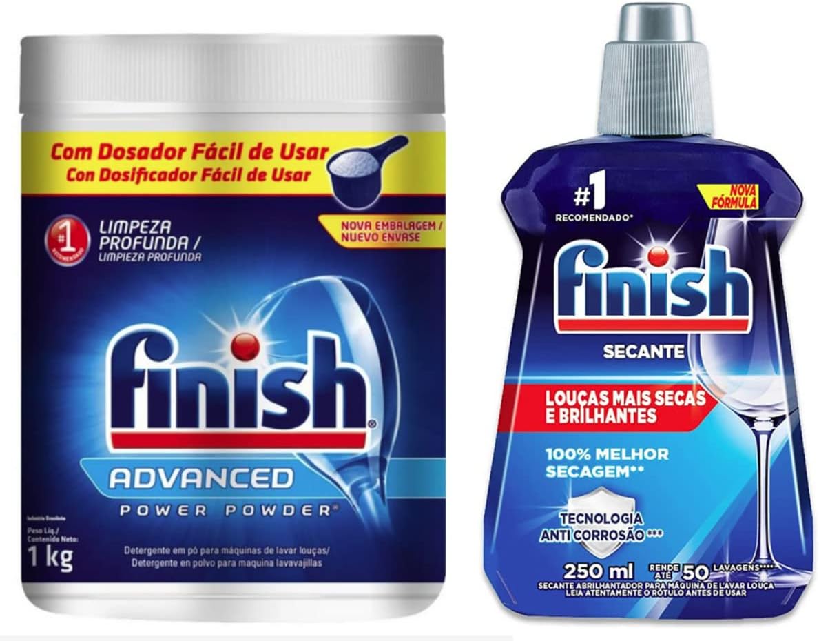KIT 1 DETERGENTE EM PO 1KG E 1 SECANTE ABRILHANTADOR 250ML FINISH. DETERGENTE EM PO: O Finish Power Powder 1kg é um detergente em pó para lava-louças que possui poderosos agentes de limpeza , remove as manchas da louça e tambem possui açao desengordurante. Vem acompanhado de uma tampa dosadora que facilita a utilização e a propria dosagem de acordo com a necessidade. Suas louças vao ficar limpas e brilhantes . SECANTE ABRILHANTADOR: 1 – Secante Para Lava Louças Abrilhantador 250ml Sabia que o líquido secante é um aditivo que tem papel fundamental no processo de lavagem da lava-louças? ele é o componente que garante a secagem das louças no final do ciclo o finish secante abrilhantador possui fórmula quick-dry, com agentes que potencializam o processo de secagem das louças, garantindo louças sequinhas, brilhantes e prontas para uso ao final do ciclo de lavagem. Benefícios: *Secagem mais rápida; *Louças sem manchas e sem resíduos; Modo De Usar: Localize o reservatório do produto secante na máquina de lava louças. Coloque o produto até preencher o compartimento. Reabastecer o compartimento com o secante regularmente.