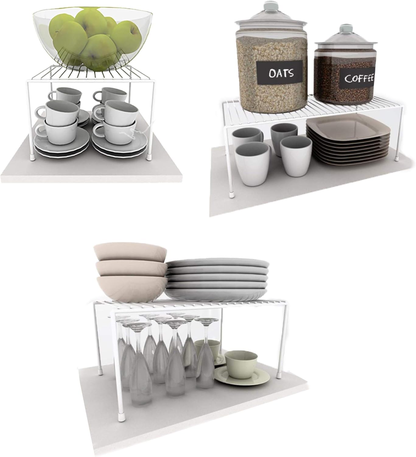 Precisando de mais espaço em seu armário ou despensa? A solução é improvisar mais um andar, ou dois… e isto, o Organizador para Armário DiCarlo Home faz muito bem! Todos os modelos com uma estrutura em aço, você tem muito mais espaço útil para aproveitar. Os organizadores de armário de cozinha aramado são ideais para proporcionar organização no armário e manter as louças em segurança, bem como otimizar o espaço, pois cria uma prateleira que permite o armazenamento produtos em lugares antes não ocupados. Versátil, pode ser usado na cozinha, despensa, lavanderia ou quarto, possui fácil sistema de instalação, pois não se faz necessário o uso de parafusos ou ferramentas, já vai pronto pra uso. O visual é moderno e aumenta a capacidade de seu armário, além de ser feito em aço e com pintura branca com tratamento antiferrugem. Aproveite! ESSE KIT CONTÉM TODAS AS PEÇAS DA 1ª FOTO: 1 – ORGANIZADOR PRATELEIRA GRANDE 1 – ORGANIZADOR PRATELEIRA MÉDIO 1 – ORGANIZADOR PRATELEIRA PEQUENO PEQUENO Largura: 20cm Altura: 15cm Comprimento: 22cm MÉDIO Largura: 20cm Altura: 15cm Comprimento: 32cm GRANDE Largura: 20cm Altura: 15cm Comprimento: 42cm