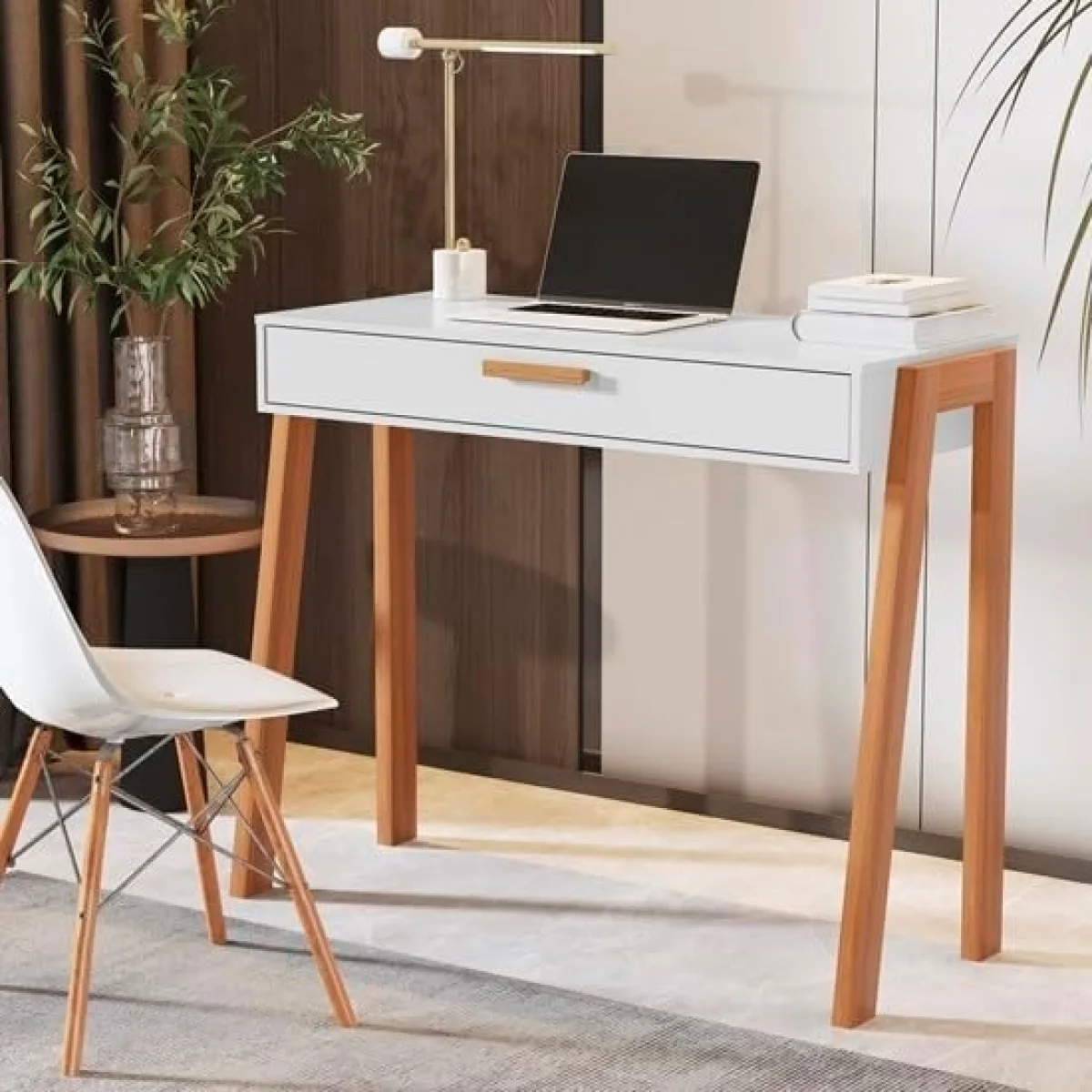 DESIGN MODERNO: Mesa de computador com estilo retrô, acabamento em branco com pés em madeira maciça natural, ideal para escritório ou home office