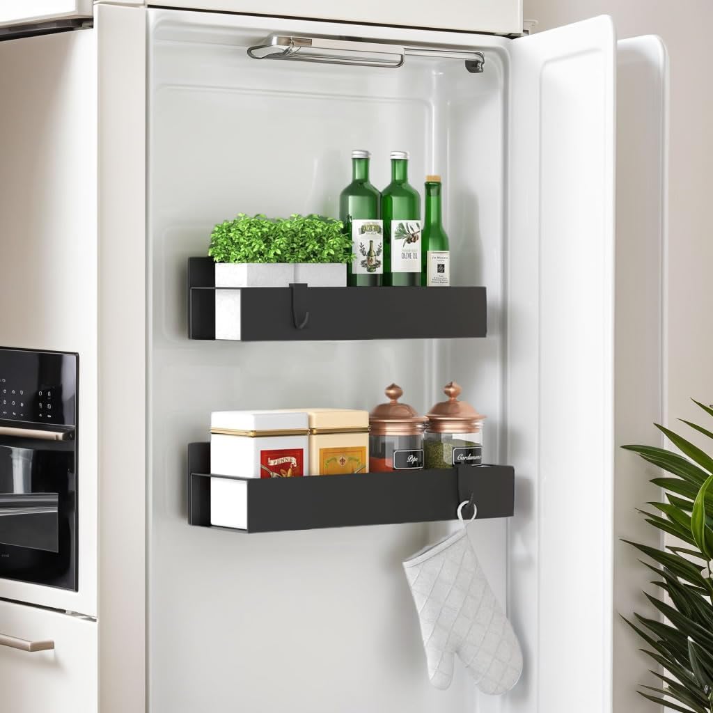 Pacote com 2 organizadores magnéticos de armazenamento de especiarias para geladeira e forno, organizador magnético móvel de especiarias, prateleira magnética forte de metal preto para