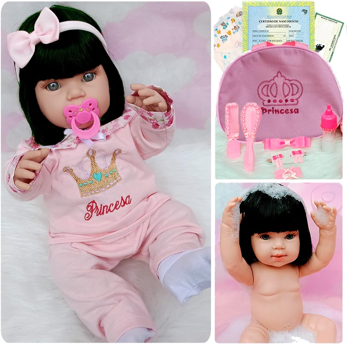 BEBÊ TIPO REBORN 100% VINIL COM ENXOVAL COMPLETO – 28 ITENS. PRODUTO COM NOTA FISCAL CORPO: 100% VINIL CABELO: PRETOS OLHOS: AZUIS TAMANHO: 45 CM PESO: APROXIMADAMENTE 1 KG Modelinho com enxoval completo, com bolsa maternidade Princesa. Corpo inteiro é no vinil, mede aproximadamente 45 cm e pesa por volta de 1kg.. CÍLIOS DE VERDADE! A Bebê Reborn pode sentar, deitar, levantar os braços e pernas. Pode dar banho. O cabelo da bebê reborn é fibra sintética, mechas implantados de ótima qualidade. SEGUE LISTA DOS ITENS QUE COMPÕE O ENXOVAL COMPLETO: 1 bebe CORPO DE SILICONE 1 pagão, sendo 1 Calça 1 Camiseta 1 Casaquinho 1 Par de luvas 1 Par de meias 1 roupa de banho 1 calcinha 1 faixa de cabelo de laço 1 bolsa maternidade princesa 3 xuxinhas de cabelo 2 presilhas de cabelo 1 par de brincos 1 par de cílios 3 fraldas descartáveis 1 pente decorado 1 escova decorada 1 mamadeira de leite falso 1 chupeta de bico 1 prendedor de chupeta 1 certidão de nascimento 1 carteira de vacinação 1 RG da sua Bebê Reborn 1 manual de cuidados com sua bebê reborn TOTALIZANDO 28 ITENS DA SUA BEBÊ REBORN! PERGUNTAS FREQUENTES: O corpo dela é de silicone ? Pode dar banho? Sim, é inteira no vinil, pode dar banho. Tem a pronta entrega? Sim, temos todas as bebês anunciadas a pronta entrega. Tem como escolher cor dos olhos e cabelo? Não é possível alterar cor de cabelos e olhos após a compra. Qual o peso da boneca? Pesa cerca de 1 kg. Qual tamanho da roupinha? Entre RN e P. ESSE ANÚNCIO TEVE MUDANÇA NO DIA 27/06 PARA CABELOS PRETOS E OLHOS AZUIS, PODE VARIAR ESTAMPA DOS ITENS